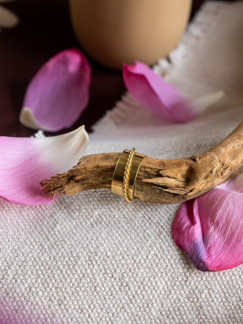 Inspired by the softness of hand-twisted threads, the Rope Wrap Brass Ring blends a smooth bold band with a delicate rope-style wrap detail. Modern, minimal, and subtly textured — it’s an everyday piece that adds quiet character to your look.