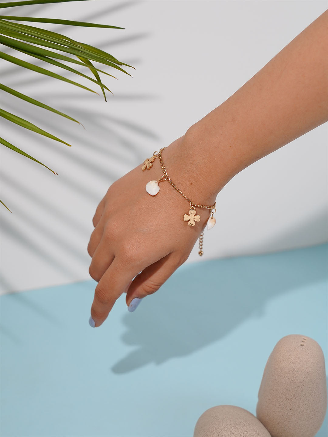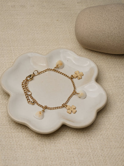 Show off your summer style with this Tropical Bracelet! This unique accessory is perfect for a beachy vacation look. Its gold tone and shell charms will have you feeling ready for a refreshing break from everyday life.