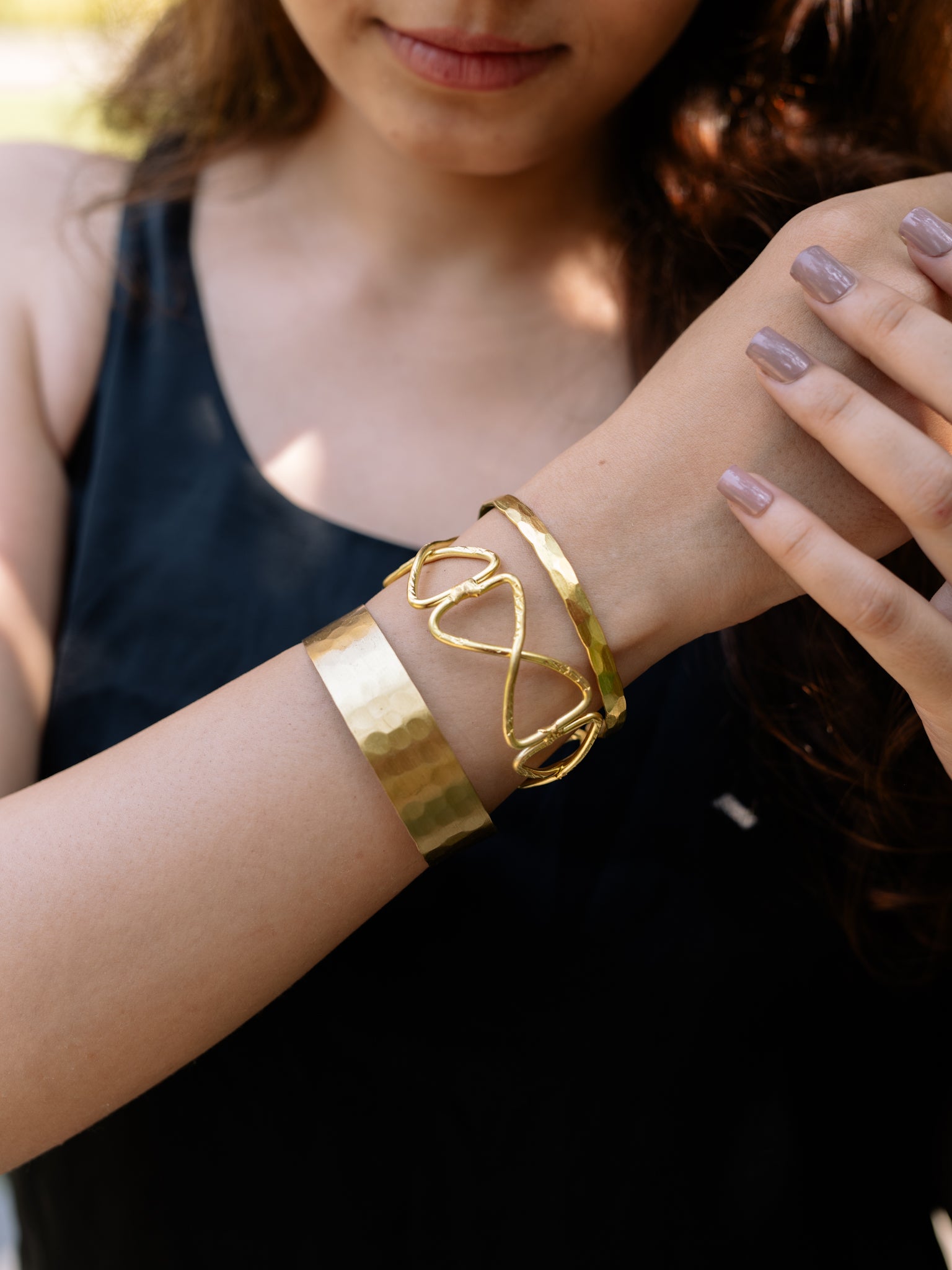This set features three uniquely designed cuffs: a sleek hammered band, a sculptural wave cuff, and a minimal polished bracelet — thoughtfully curated to be worn together or styled individually. The layered look adds instant sophistication, making it perfect for power dressing, festive styling, or chic casual wear.