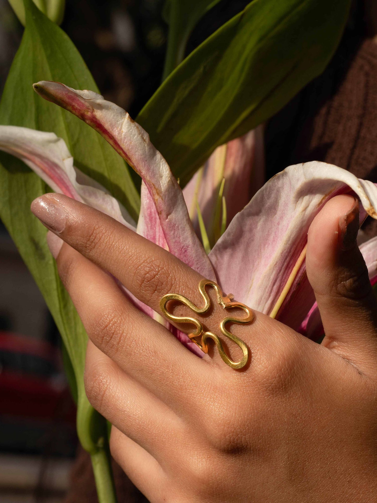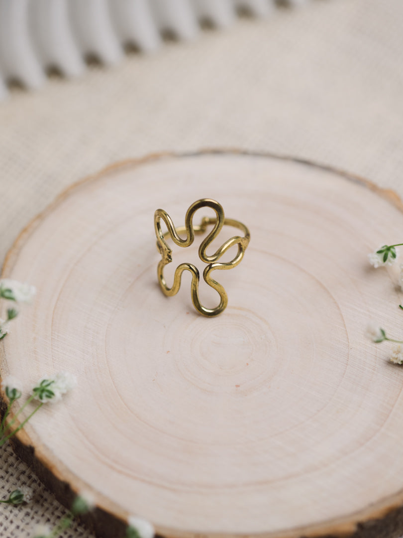 - Hollow Flower Adjustable Brass Ring ( Anti Tarnish)