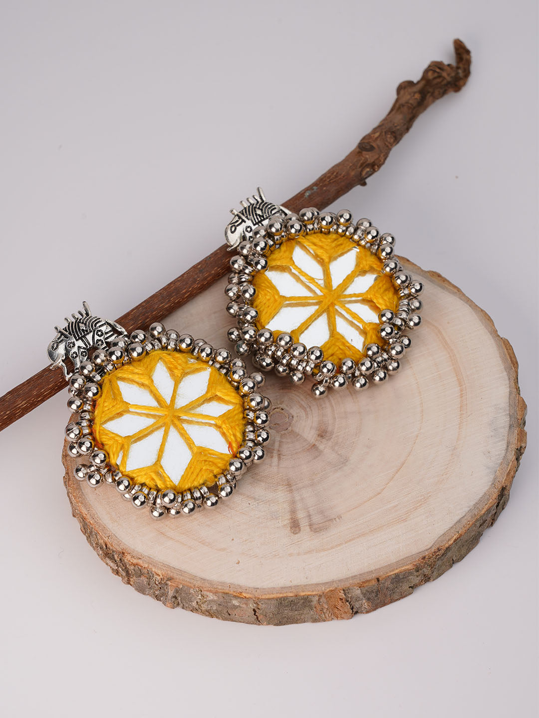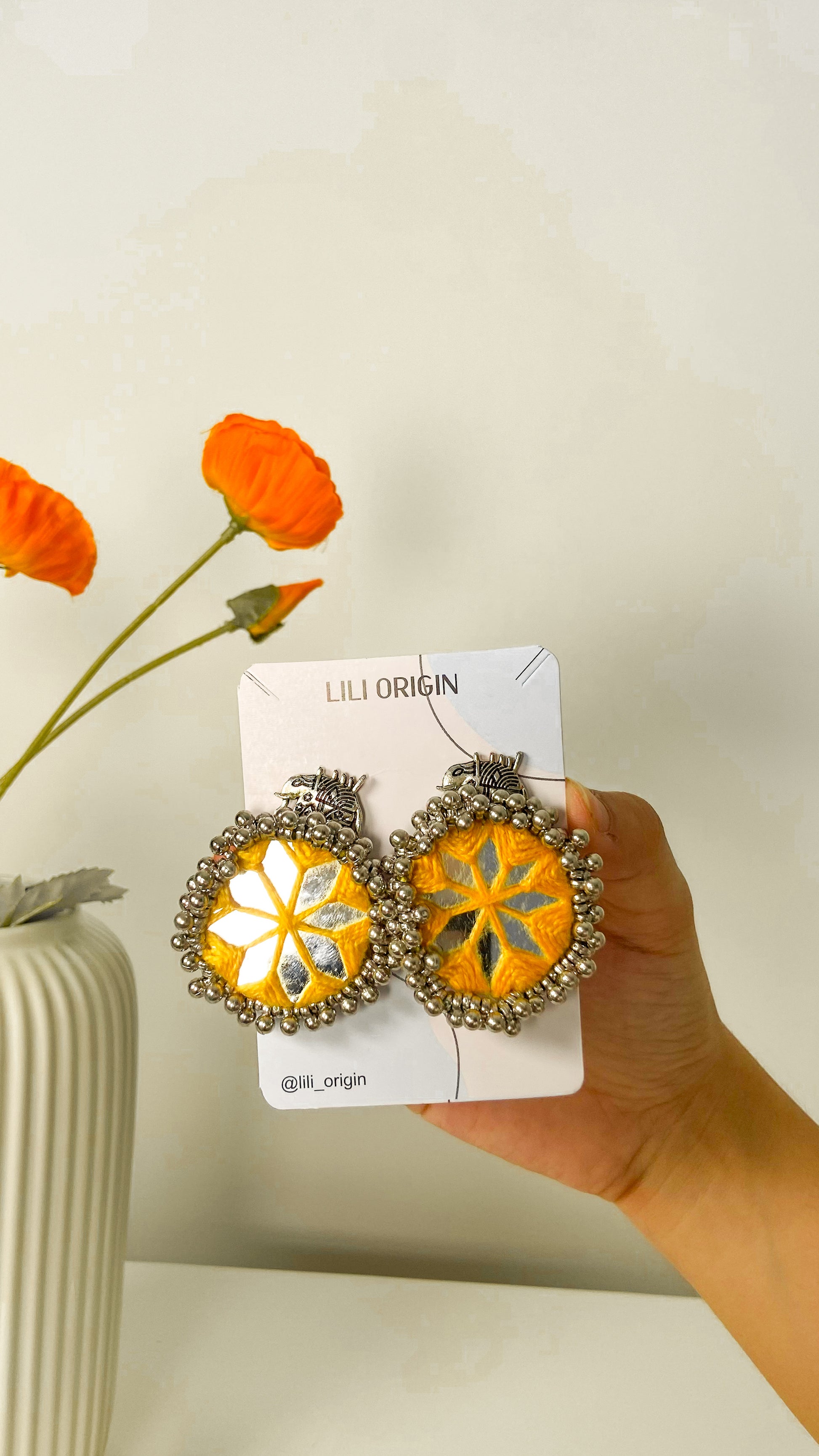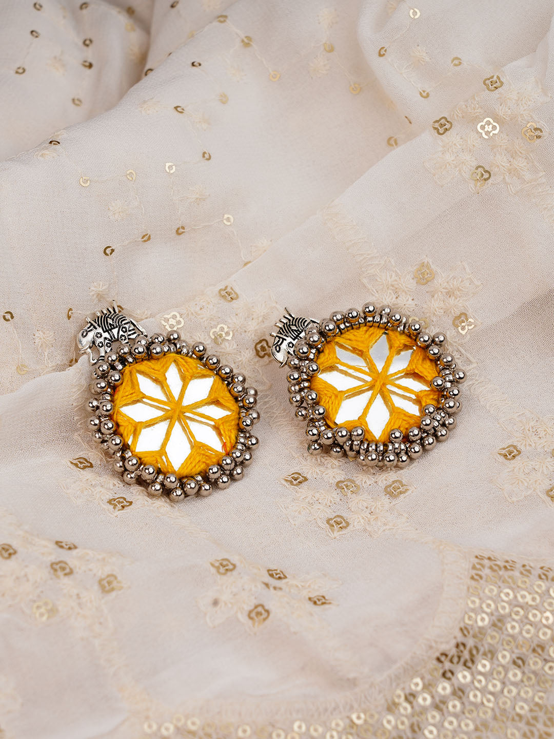 This beautiful Yellow handmade Fabric Earring is crafted with Mirrors and oxidized silver. It features a unique design and has been carefully handmade with fabric for maximum comfort and durability. Perfect for a special occasion, this jewelry is sure to make a statement.
