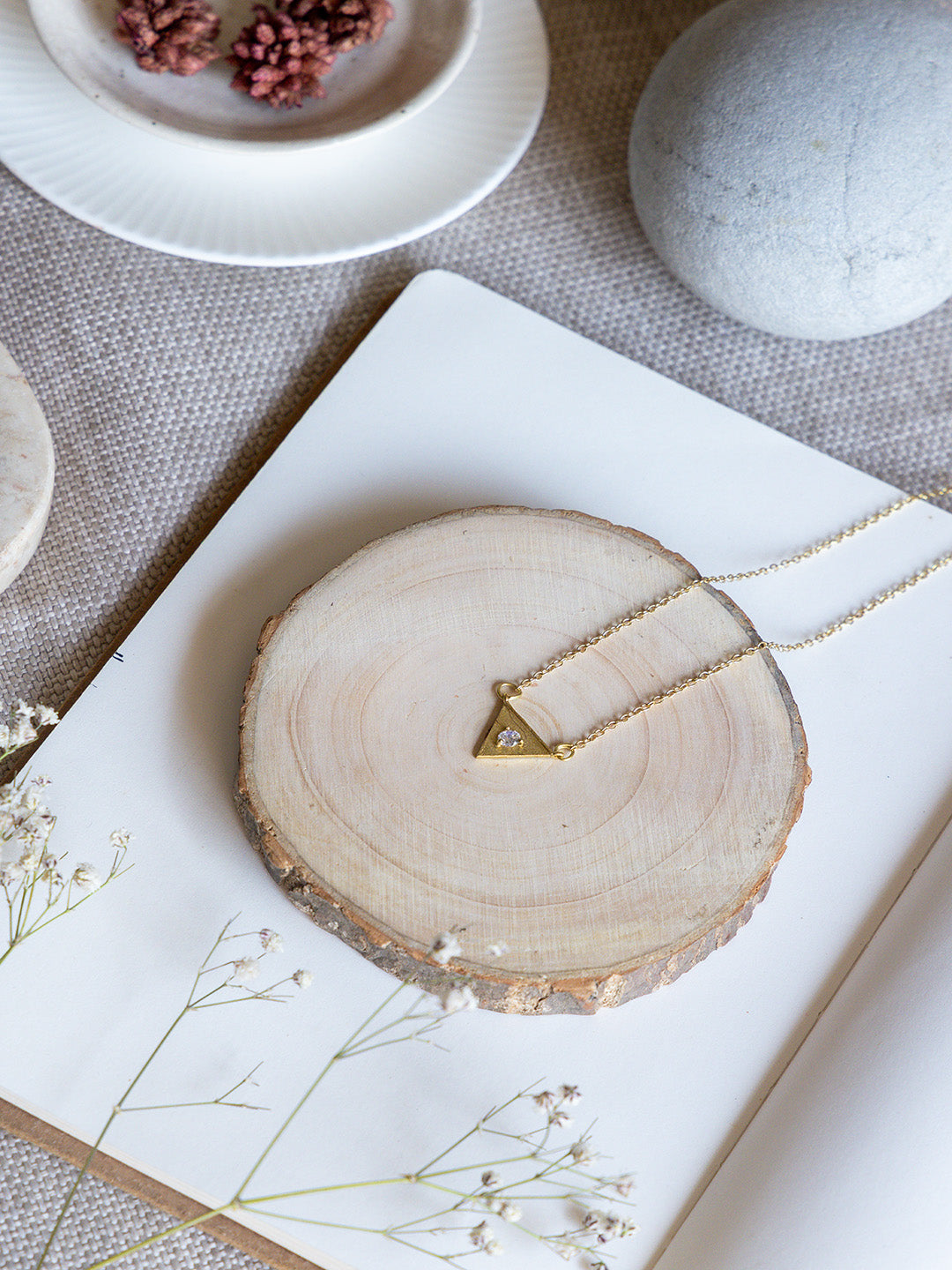The Trinity Spark Necklace features a sleek triangle pendant crafted in brass, highlighted with a subtle sparkling stone at its centre. Designed with clean geometric lines, this necklace brings a modern yet timeless touch to everyday jewellery styling.