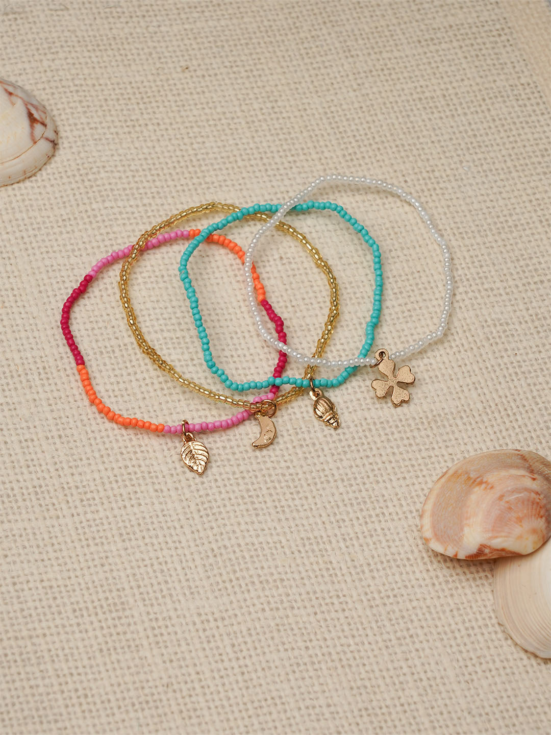 This 4-pack of handmade beaded bracelets is the perfect accessory for any look. Each piece contains an elastic bracelet threaded with colorful beads and a charm, making them easy to wear and adjustable for any wrist size. Get your hands on this unique set of beaded bracelets for a stylish and fun addition to your wardrobe.