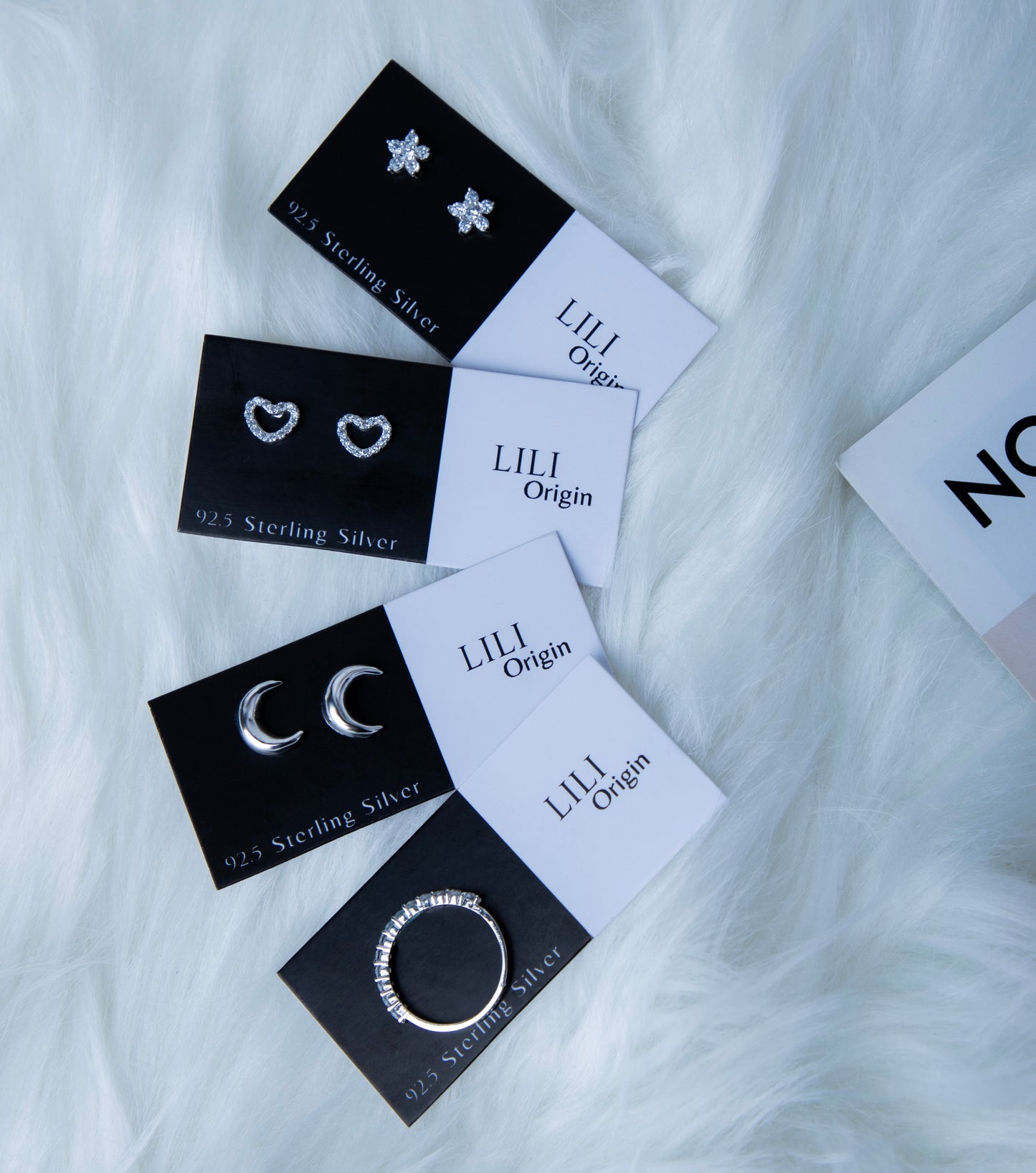This luxurious combo of 4 offers a unique accessory selection crafted from sterling silver. Each piece is adorned with exquisite zircon for added glamour, including a heart-shaped zircon, a moon crest earring, a star earring, and a white line ring. Enhance your look with this beautiful set.