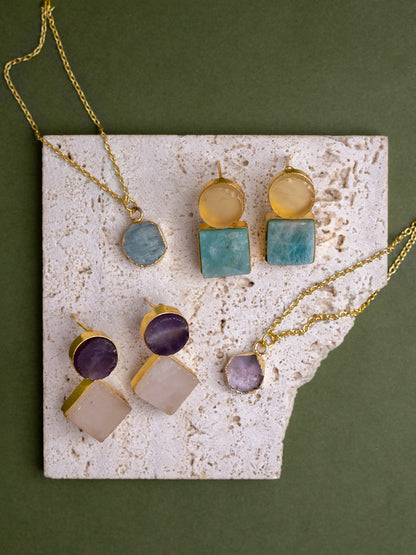 - Lemon Quartz Circle Two Stone Crystal Earring (Lemon Quartz + Green Amazonite)