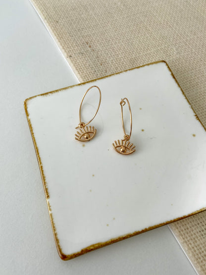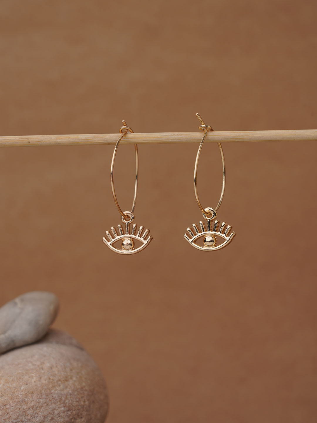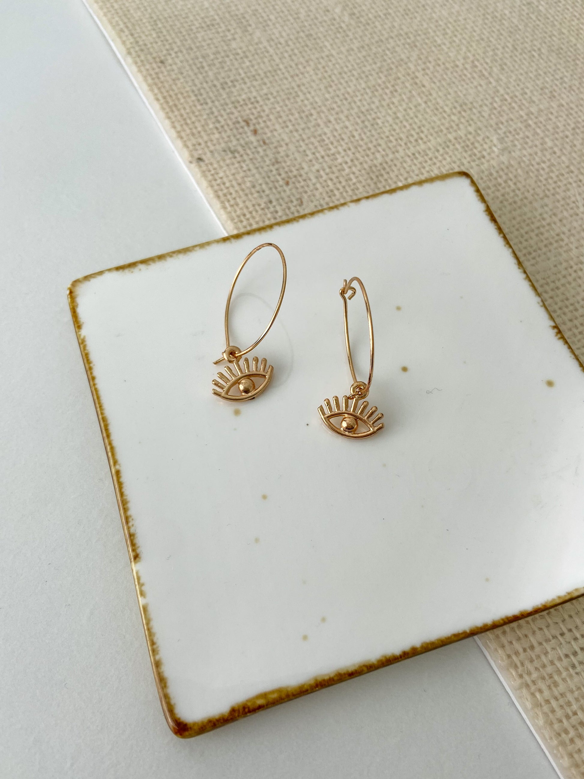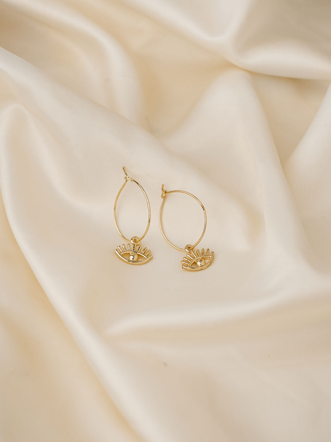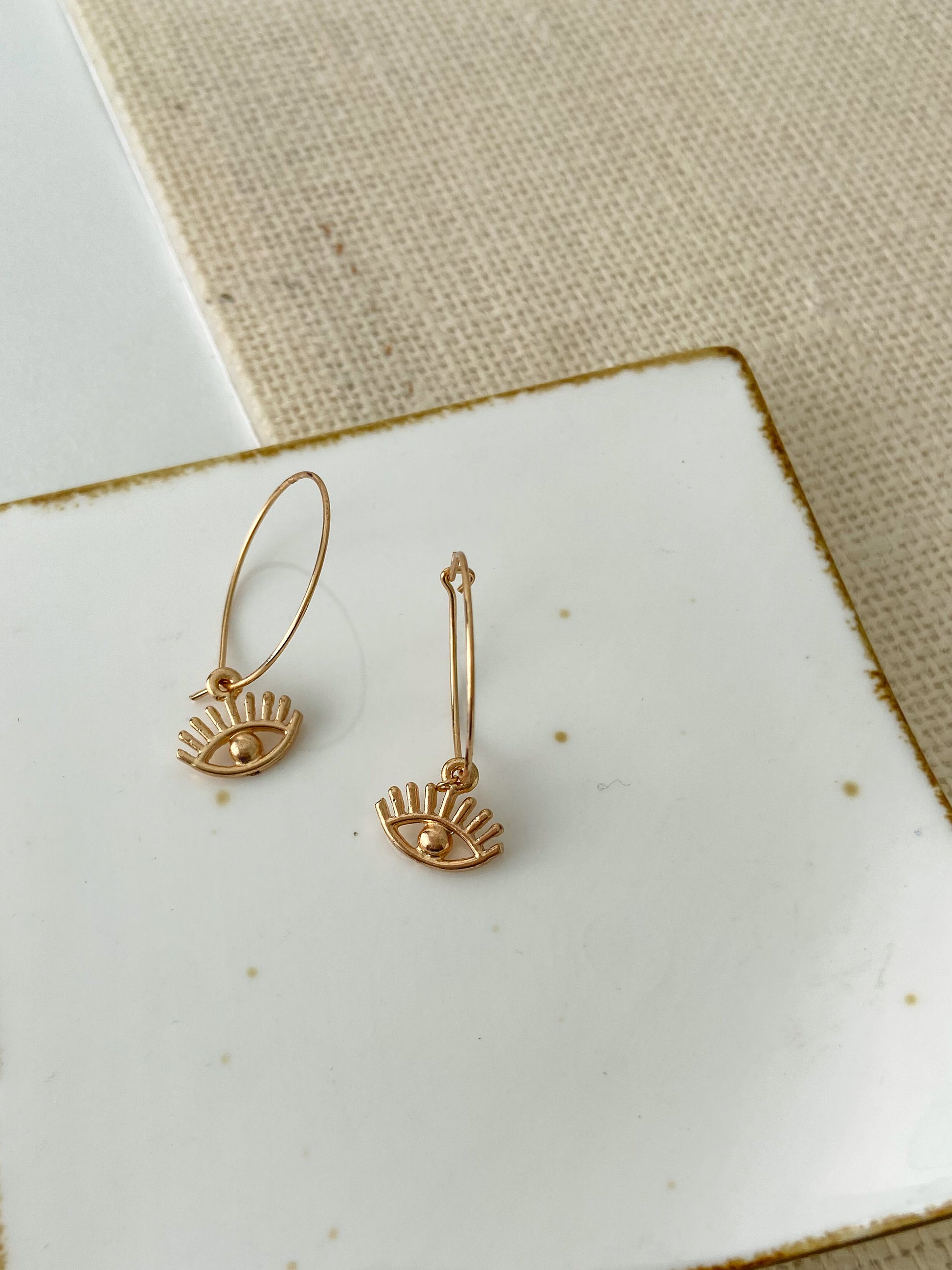 These Evil Eye Earrings are perfect for everyday wear. Beautiful, simple, and stylish, they feature a beautiful eye charm on a lightweight, comfortable hoop.
