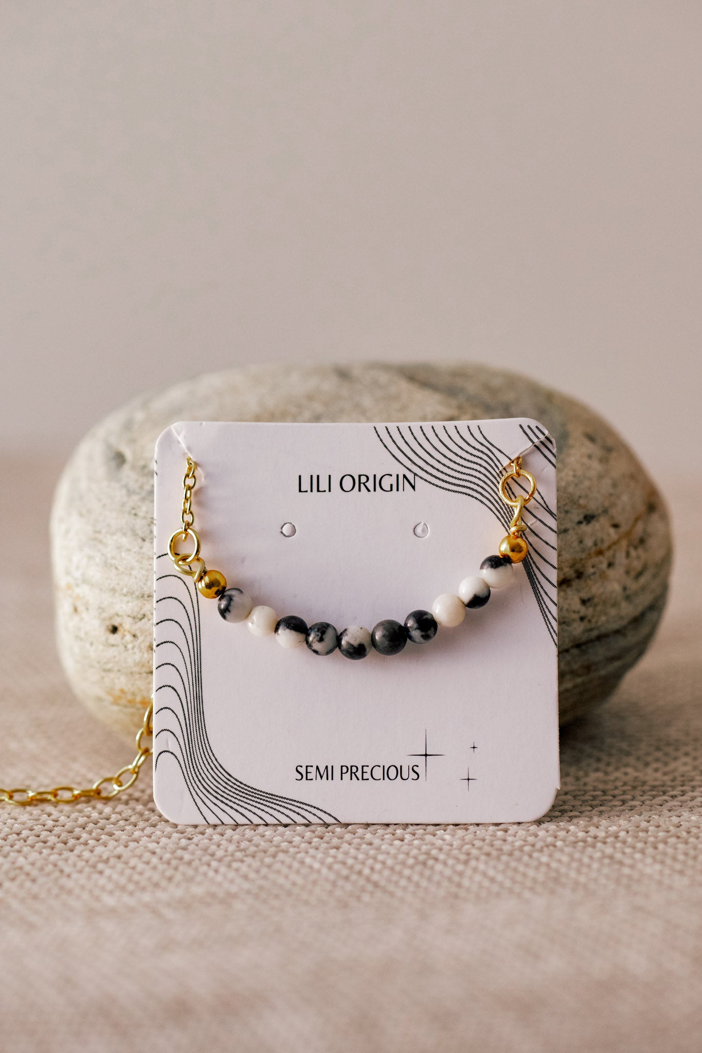 This bracelet is made from high-quality Howlite gemstone, plated with 18K gold for a luxurious finish. Handcrafted with precision and adorned with attention to detail, this bracelet features Howlite gemstone and 18K gold plating for a luxurious and elegant look. Experience the purity and beauty of genuine gemstones with the added touch of gold, elevating your style and adding a touch of sophistication to any outfit.